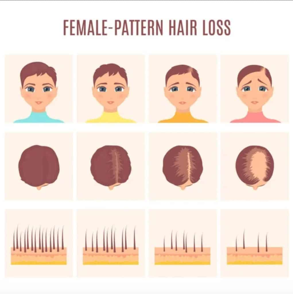 Male pattern baldness and female pattern baldness have different hair loss patterns specifically, however androgenic alopecia is characterized by thinning hair at the crown of the head in both sexes.