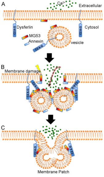 As a neuromuscular junction, it functions to propagate action potentials and is involved in excitation-contraction coupling. Furthermore, calcium influx through the sarcolemma allows it to repair and continue to maintain a barrier function. If the membrane is damaged, calcium enters which triggers vesicle exocytosis and vesicle fusion leading to the formation of a patch at the site of injury (membrane patch). Figure 8 shows this process. Abnormal calcium flow can lead to problems with muscle fiber function. It causes changes in ion regulation in muscle proteins. It is thought that incorrect calcium flow may be involved in muscle fiber degradation in muscular dystrophy.